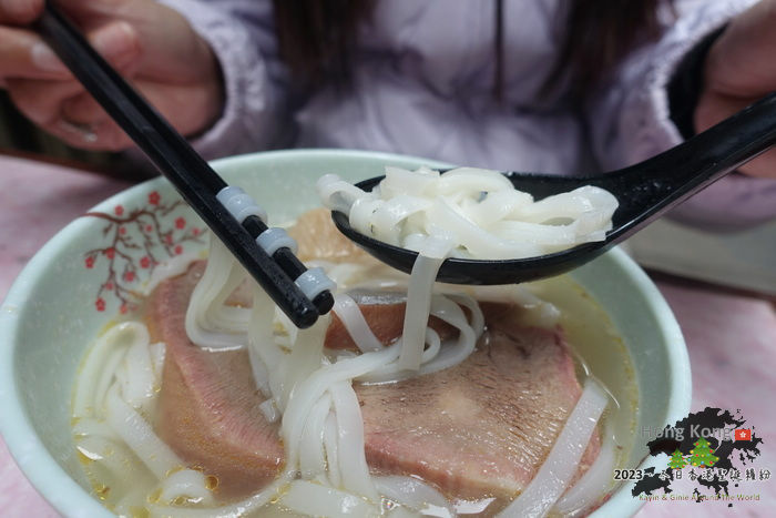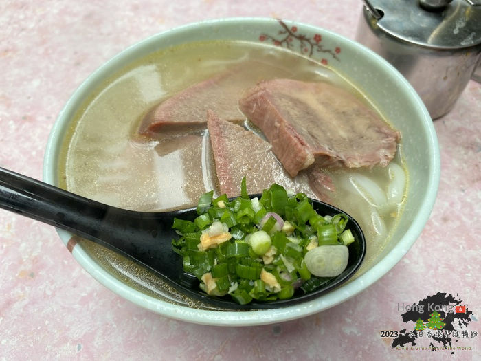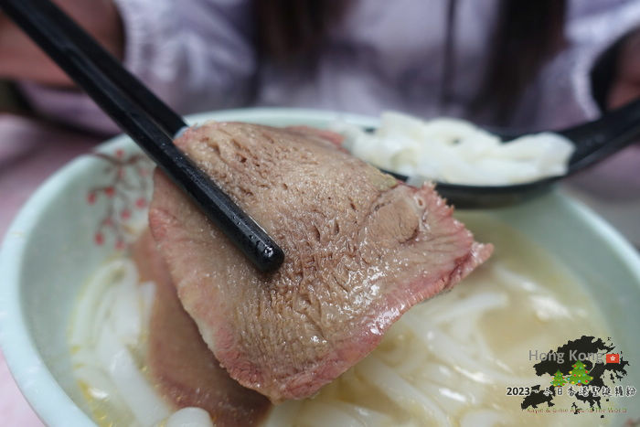 我們點了兩份餐點,一份是單拚的「牛舌芯河粉」、一份45 HKD,厚切的牛舌非常美味、份量十足,相當好吃。上菜的時候還會將蔥另外放,超適合不吃蔥的我。